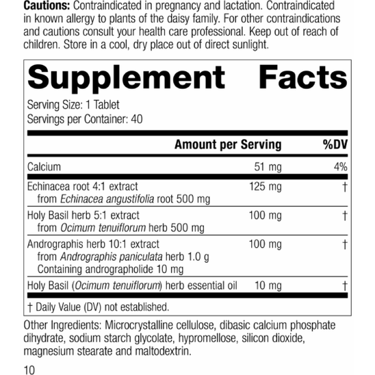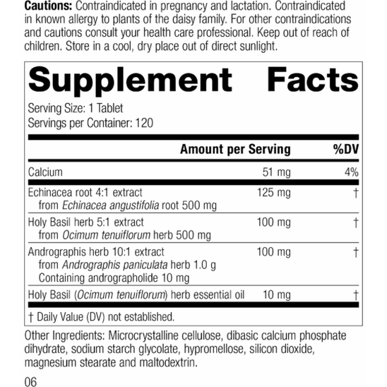 Each Serving Size (1 Tablet) contains: Calcium 51 mg, Echinacea root 4:1 extract 125 mg (from Echinacea angustifolia root 500 mg), Holy Basil herb 5:1 extract 100 mg (from Ocimum tenuiflorum herb 500 mg), Andrographis herb 10:1 extract 100 mg (from Andrographis paniculata herb 1.0 g, Containing andrographolide 10 mg), Holy Basil (Ocimum tenuiflorum) herb essential oil 10 mg. Other Ingredients: Microcrystalline cellulose, dibasic calcium phosphate dihydrate, sodium starch glycolate, hypromellose, silicon dioxide, magnesium stearate and maltodextrin.