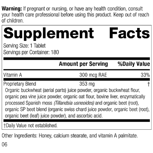 Each Serving Size (1 Tablet) contains: Vitamin A 300 mcg RAE. Proprietary Blend 353 mg: Organic buckwheat (aerial parts) juice powder, organic buckwheat flour, organic pea vine juice powder, organic oat flour, bovine liver, enzymatically processed Spanish moss (Tillandsia usneoides) and organic beet (root), organic SP beet blend (organic swiss chard juice powder, organic beet (root), organic beet (leaf) juice powder), and ascorbic acid. Other Ingredients: Honey, calcium stearate, and vitamin A palmitate.