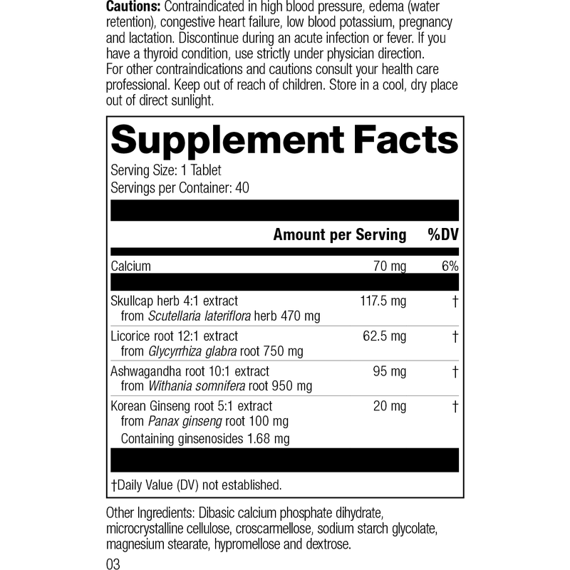 Each Serving Size (1 Tablet) contains: Calcium 70 mg, Skullcap herb 4:1 extract 117.5 mg (from Scutellaria lateriflora herb 470 mg), Licorice root 12:1 extract 62.5 mg (from Glycyrrhiza glabra root 750 mg), Ashwagandha root 10:1 extract 95 mg (from Withania somnifera root 950 mg), Korean Ginseng root 5:1 extract 20 mg (from Panax ginseng root 100 mg, Containing ginsenosides 1.68 mg). Other Ingredients: Dibasic calcium phosphate dihydrate, microcrystalline cellulose, croscarmellose, sodium starch glycolate, magnesium stearate, hypromellose and dextrose.