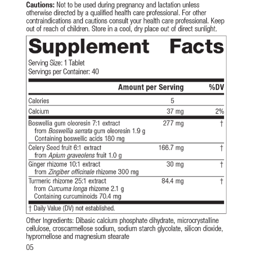 Each Serving Size (1 Tablet) contains: Calories 5, Calcium 37 mg, Boswellia gum oleoresin 7:1 extract 277 mg (from Boswellia serrata gum oleoresin 1.9 g, Containing boswellic acids 180 mg), Celery Seed fruit 6:1 extract 166.7 mg (from Apium graveolens fruit 1.0 g), Ginger rhizome 10:1 extract 30 mg (from Zingiber officinale rhizome 300 mg), Turmeric rhizome 25:1 extract 84.4 mg (from Curcuma longa rhizome 2.1 g, Containing curcuminoids 70.4 mg). Other Ingredients: Dibasic calcium phosphate dihydrate, microcrystalline cellulose, croscarmellose sodium, sodium starch glycolate, silicon dioxide, hypromellose and magnesium stearate.