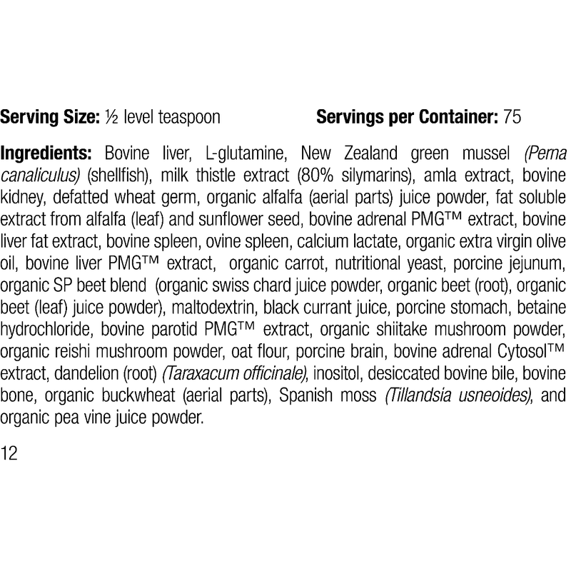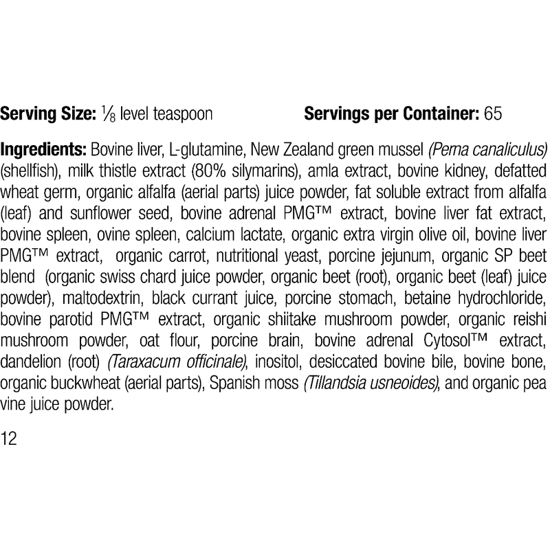 Each Serving Size (1/8 level teaspoon) contains: Ingredients: Bovine liver, L-glutamine, New Zealand green mussel (Perna canaliculus) (shellfish), milk thistle extract (80% silymarins), amla extract, bovine kidney, defatted wheat germ, organic alfalfa (aerial parts) juice powder, fat soluble extract from alfalfa (leaf) and sunflower seed, bovine adrenal PMG™ extract, bovine liver fat extract, bovine spleen, ovine spleen, calcium lactate, organic extra virgin olive oil, bovine liver PMG™ extract, organic carrot, nutritional yeast, porcine jejunum, organic SP beet blend (organic swiss chard juice powder, maltodextrin, organic beet (root), organic beet (leaf) juice powder), black currant juice, porcine stomach, betaine hydrochloride, bovine parotid PMG™ extract, organic shiitake mushroom powder, organic reishi mushroom powder, oat flour, porcine brain, bovine adrenal Cytosol™ extract, dandelion (root) (Taraxacum officinale), inositol, desiccated bovine bile, bovine bone, organic buckwheat (aerial parts), Spanish moss (Tillandsia usneoides), and organic pea vine juice powder.