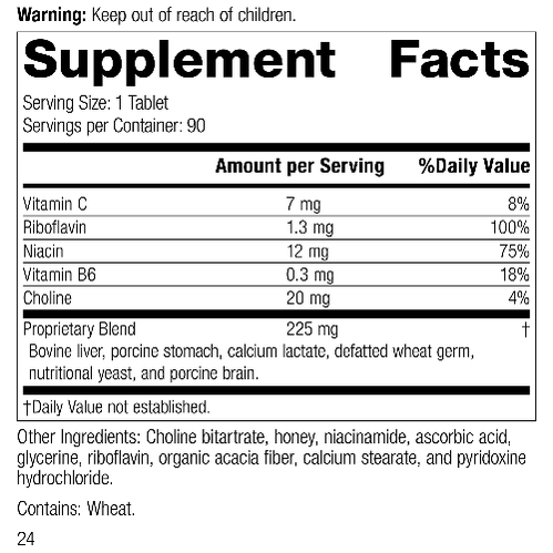 Each Serving Size (1 Tablet) contains: Vitamin C 7 mg, Riboflavin 1.3 mg, Niacin 12 mg, Vitamin B6 0.3 mg, Choline 20 mg. Proprietary Blend 225 mg: Bovine liver, porcine stomach, calcium lactate, defatted wheat germ, nutritional yeast, and porcine brain. Other Ingredients: Choline bitartrate, honey, niacinamide, ascorbic acid, glycerine, riboflavin, organic acacia fiber, calcium stearate, and pyridoxine hydrochloride. Contains: Wheat.