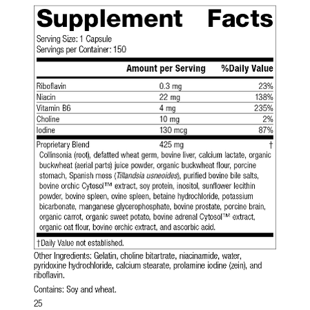 Each Serving Size (1 Capsule) contains: Riboflavin 0.3 mg, Niacin 22 mg, Vitamin B6 4 mg, Choline 10 mg, Iodine 130 mcg. Proprietary Blend 425 mg: Collinsonia (root), defatted wheat germ, bovine liver, calcium lactate, organic buckwheat (aerial parts) juice powder, organic buckwheat flour, porcine stomach, Spanish moss (Tillandsia usneoides), purified bovine bile salts, bovine orchic Cytosol™ extract, soy protein, inositol, sunflower lecithin powder, bovine spleen, ovine spleen, betaine hydrochloride, potassium bicarbonate, manganese glycerophosphate, bovine prostate, porcine brain, organic carrot, organic sweet potato, bovine adrenal Cytosol™ extract, organic oat flour, bovine orchic extract, and ascorbic acid. Other Ingredients: Gelatin, choline bitartrate, niacinamide, water, pyridoxine hydrochloride, calcium stearate, prolamine iodine (zein), and riboflavin. Contains: Soy and wheat.