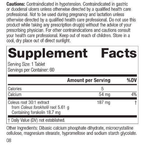 Each Serving Size (1 Tablet) contains: 5 Calories, Calcium 54 mg, Coleus root 30:1 extract 187 mg (from Coleus forskholii root 5.61 g, Containing forskolin 18.7 mg). Other Ingredients: Dibasic calcium phosphate dihydrate, microcrystalline cellulose, magnesium stearate, hypromellose and sodium starch glycolate.