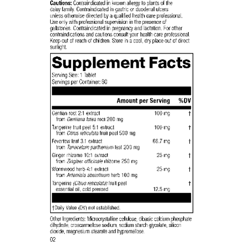 Each Serving Size (1 Tablet) contains: Gentian root 2:1 extract 100 mg (from Gentiana lutea root 200 mg), Tangerine fruit peel 5:1 extract 100 mg (from Citrus reticulata fruit peel 500 mg), Feverfew leaf 3:1 extract 66.7 mg (from Tanacetum parthenium leaf 200 mg), Ginger rhizome 10:1 extract 25 mg (from Zingiber officinale rhizome 250 mg), Wormwood herb 4:1 extract 25 mg (from Artemisia absinthium herb 100 mg), Tangerine (Citrus reticulata) fruit peel essential oil, cold pressed 12.5 mg, Other Ingredients: Microcrystalline cellulose, dibasic calcium phosphate dihydrate, croscarmellose sodium, sodium starch glycolate, silicon dioxide, magnesium stearate and hypromellose.