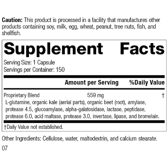 Each Serving Size (1 Capsule) contains: Proprietary Blend 559 mg: L-glutamine, organic kale (aerial parts), organic beet (root), amylase, protease 4.5, glucoamylase, alpha-galatosidase, lactase, peptidase, protease 6.0, acid maltase, protease 3.0, invertase, lipase, and bromelain.