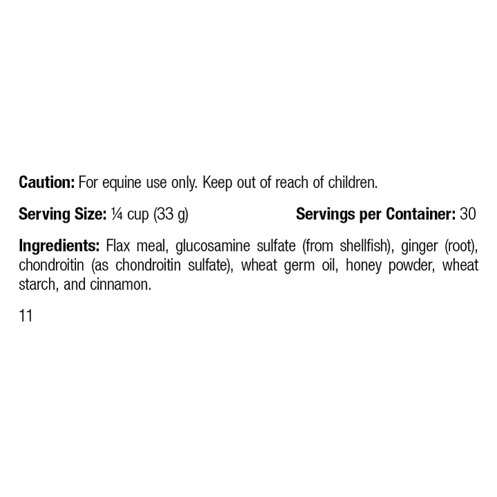 Each Serving Size (1/4 cup) contains: Flax meal, glucosamine sulfate (from shellfish), ginger (root), chondroitin (as chondroitin sulfate), wheat germ oil, honey powder, and cinnamon.