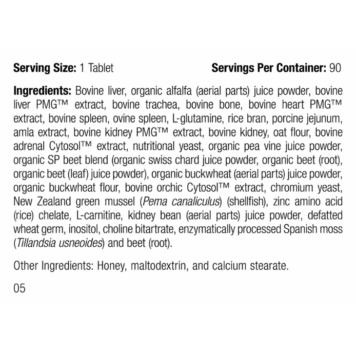 Each Serving Size (1 Tablet) contains: Ingredients: Bovine liver, organic alfalfa (aerial parts) juice powder, bovine liver PMGTM extract, bovine trachea, bovine bone, bovine heart PMGTM extract, bovine spleen, ovine spleen, L-glutamine, rice bran, porcine jejunum, amla extract, bovine kidney PMGTM extract, bovine kidney, oat flour, bovine adrenal CytosolTM extract, nutritional yeast, organic pea vine juice powder, organic SP beet blend (organic swiss chard juice powder, organic beet (root), organic beet (leaf) juice powder), organic buckwheat (aerial parts) juice powder, organic buckwheat flour, bovine orchic CytosolTM extract, chromium yeast, New Zealand green mussel (Perna canaliculus) (shellfish), zinc amino acid (rice) chelate, L-carnitine, kidney bean (aerial parts) juice powder, defatted wheat germ, inositol, choline bitartrate, enzymatically processed Spanish moss (Tillandsia usneoides) and beet (root). Other Ingredients: Honey, maltodextrin, and calcium stearate.