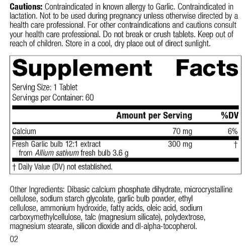 Each Serving Size (1 Tablet) contains: Calcium 70 mg, Fresh Garlic bulb 12:1 extract 300 mg (from Allium sativum fresh bulb 3.6 g). Other Ingredients: Dibasic calcium phosphate dihydrate, microcrystalline cellulose, sodium starch glycolate, garlic bulb powder, ethyl cellulose, ammonium hydroxide, fatty acids, oleic acid, sodium carboxymethylcellulose, talc (magnesium silicate), polydextrose, magnesium stearate, silicon dioxide and dl-alpha-tocopherol.
