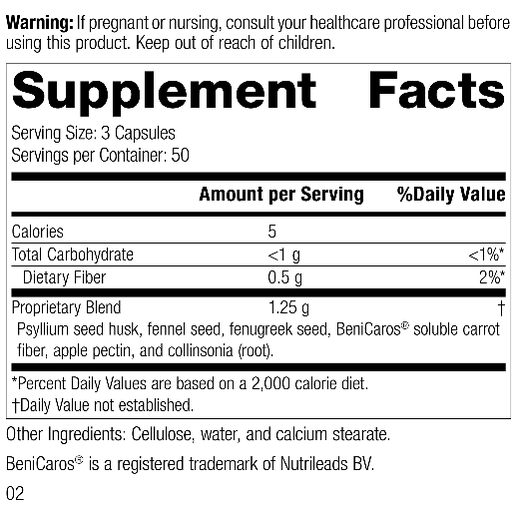 Nutrients & Ingredients – Each Serving Size (3 Capsules) contains: Calories 5, Total Carbohydrate <1 g, Dietary Fiber 0.5 g. Proprietary Blend 1.25 g: Psyllium seed husk, fennel seed, fenugreek seed, BeniCaros® soluble carrot fiber, apple pectin, and collinsonia (root). Other Ingredients: Cellulose, water, and calcium stearate.