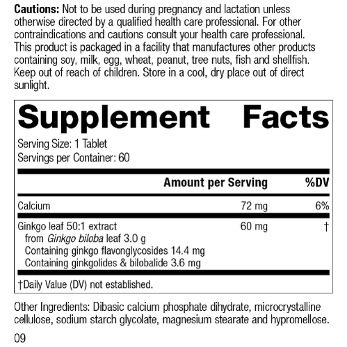 Each Serving Size (1 Tablet) contains: Calcium 72 mg, Ginkgo leaf 50:1 extract 60 mg (from Ginkgo biloba leaf 3.0 g, Containing ginkgo flavonglycosides 14.4 mg, Containing ginkgolides & bilobalide 3.6 mg). Other Ingredients: Dibasic calcium phosphate dihydrate, microcrystalline cellulose, sodium starch glycolate, magnesium stearate and hypromellose.