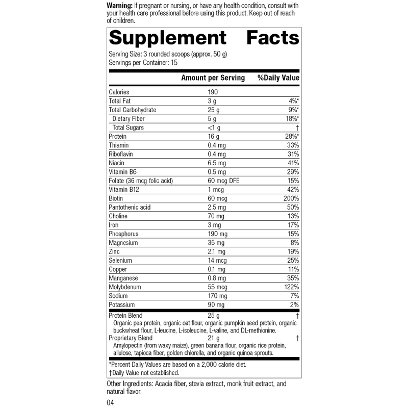 Nutrients & Ingredients –Each Serving Size (3 rounded scoop) contains: Calories 190, Total Fat 3 g, Total Carbohydrate 25 g, Dietary Fiber 5 g, Total Sugars <1 g, Protein 16 g, Thiamin 0.4 mg, Riboflavin 0.4 mg, Niacin 6.5 mg, Vitamin B6 0.5 mg, Folate (36 mcg folic acid) 60 mcg DFE, Vitamin B12 1 mcg, Biotin 60 mcg, Pantothenic acid 2.5 mg, Choline 70 mg, Iron 3 mg, Phosphorus 190 mg, Magnesium 35 mg, Zinc 2.1 mg, Selenium 14 mcg, Copper 0.1 mg, Manganese 0.8 mg Molybdenum 55 mcg, Sodium 170 mg, Potassium 90 mg. Protein Blend 25 g: Organic pea protein, organic oat flour, organic pumpkin seed protein, organic buckwheat flour, L-leucine, L-isoleucine, L-valine, and DL-methionine. Proprietary Blend 21 g: Amylopectin (from waxy maize), green banana flour, organic rice protein, allulose, tapioca fiber, golden chlorella, and organic quinoa sprouts. Other Ingredients: Acacia fiber, stevia extract, monk fruit extract, and natural flavor.