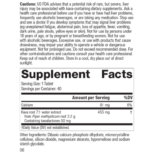 This tablet contains Kava root extracted with 100% water, which provides an extract with a full spectrum of compounds including kavalactones. This product is standardized to contain 50 mg of kavalactones per tablet to ensure optimal strength and quality.