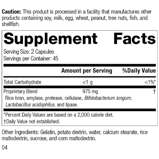 Each Serving Size (2 capsules) contains: <1 g Total Carbohydrate. Proprietary Blend 975 mg: Rice bran, amylase, protease, cellulase, Bifidobacterium longum, Lactobacillus acidophilus, and lipase. Other Ingredients: Gelatin, potato dextrin, water, calcium stearate, rice maltodextrin, sucrose, and corn maltodextrin.