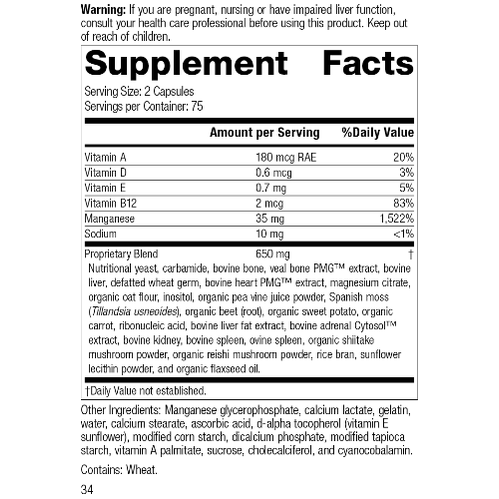 Each Serving Size (2 Capsules) contains: Vitamin A 180 mcg RAE, Vitamin D 0.6 mcg, Vitamin E 0.7 mg, Vitamin B12 2 mcg, Manganese 35 mg, Sodium 10 mg. Proprietary Blend 650 mg: Nutritional yeast, carbamide, bovine bone, veal bone PMG™ extract, bovine liver, defatted wheat germ, bovine heart PMG™ extract, magnesium citrate, organic oat flour, inositol, organic pea vine juice powder, Spanish moss (Tillandsia usneoides), organic beet (root), organic sweet potato, organic carrot, ribonucleic acid, bovine liver fat extract, bovine adrenal Cytosol™ extract, bovine kidney, bovine spleen, ovine spleen, organic shiitake mushroom powder, organic reishi mushroom powder, rice bran, sunflower lecithin powder, and organic flaxseed oil. Other Ingredients: Manganese glycerophosphate, calcium lactate, gelatin, water, calcium stearate, ascorbic acid, d-alpha tocopherol (vitamin E sunflower), modified corn starch, dicalcium phosphate, modified tapioca starch, vitamin A palmitate, sucrose, cholecalciferol, and cyanocobalamin. Contains: Wheat.