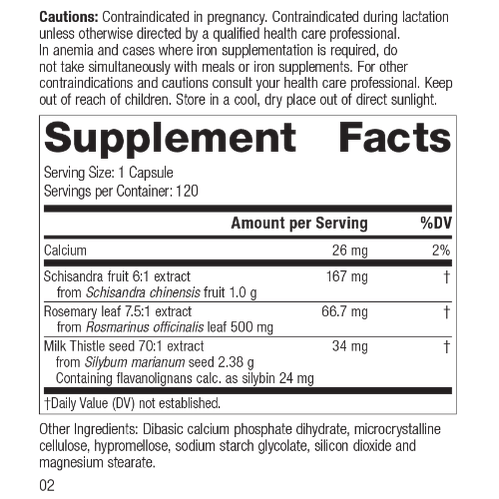 Each Serving Size (1 Capsule) contains: Calcium 26 mg, Schisandra fruit 6:1 extract 167 mg (from Schisandra chinensis fruit 1.0 g), Rosemary leaf 7.5:1 extract 66.7 mg (from Rosmarinus officinalis leaf 500 mg), Milk Thistle seed 70:1 extract 34 mg (from Silybum marianum seed 2.38 g, Containing flavanolignans calc. as silybin 24 mg). Other Ingredients: Dibasic calcium phosphate dihydrate, microcrystalline cellulose, hypromellose, sodium starch glycolate, silicon dioxide and magnesium stearate.