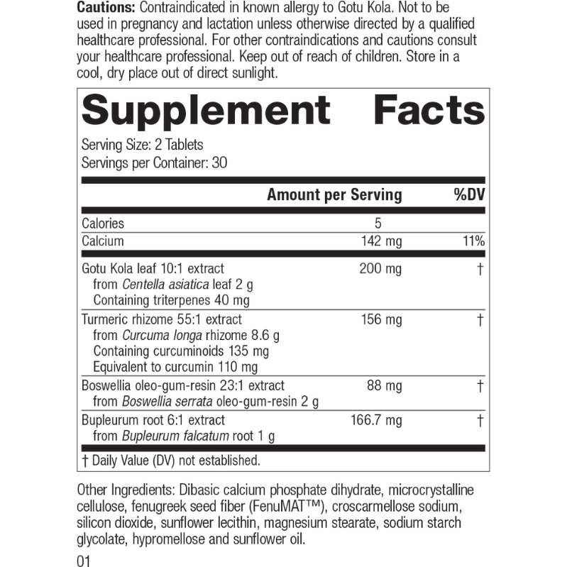 Each Serving Size (2 Tablets) contains: Calories 5, Calcium 142 mg, Gotu Kola leaf 10:1 extract 200 mg (from Centella asiatica leaf 2 g, Containing triterpenes 40 mg), Turmeric rhizome 55:1 extract 156 mg (from Curcuma longa rhizome 8.6 g, Containing curcuminoids 135 mg, Equivalent to curcumin 110 mg), Boswellia oleo-gum-resin 23:1 extract 88 mg (from Boswellia serrata oleo-gum-resin 2 g), Bupleurum root 6:1 extract 166.7 mg (from Bupleurum falcatum root 1 g). Other Ingredients: Dibasic calcium phosphate dihydrate, microcrystalline cellulose, fenugreek seed fiber (FenuMATTM), croscarmellose sodium, silicon dioxide, sunflower lecithin, magnesium stearate, sodium starch glycolate, hypromellose and sunflower oil.