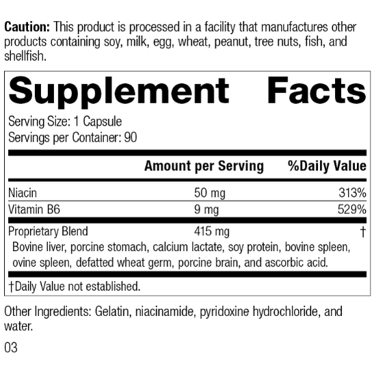 Each Serving Size (1 Capsule) contains: Niacin 50 mg, Vitamin B6 9 mg. Proprietary Blend 415 mg: Bovine liver, porcine stomach, calcium lactate, soy protein, bovine spleen, ovine spleen, defatted wheat germ, porcine brain, and ascorbic acid. Other Ingredients: Gelatin, niacinamide, pyridoxine hydrochloride, and water.