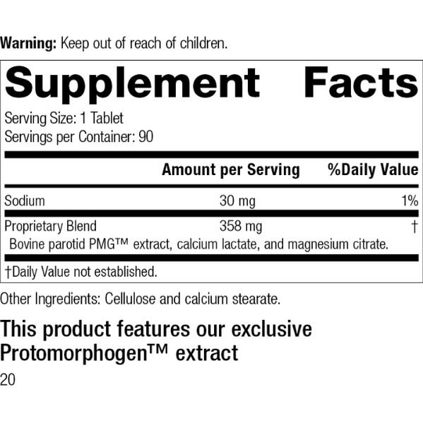 Each Serving Size (1 tablet) contains: 30 mg Sodium. Proprietary Blend 358 mg: Bovine parotid PMG™ extract, calcium lactate, and magnesium citrate. Other Ingredients: Cellulose and calcium stearate.