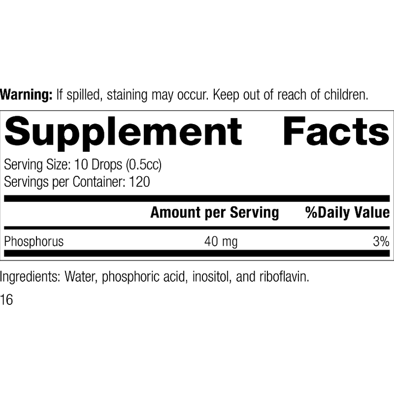 Each Serving Size (10 drops) contains: Phosphorus 40 mg. Ingredients: Water, phosphoric acid, inositol, and riboflavin.