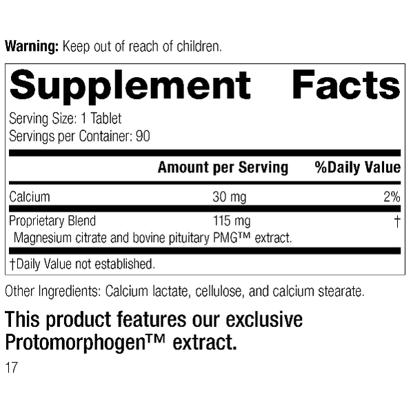 Each Serving Size (1 tablet) contains: Calcium 30 mg. Proprietary Blend 115 mg: Magnesium citrate and bovine pituitary PMG™ extract. Other Ingredients: Calcium lactate, cellulose, and calcium stearate.
