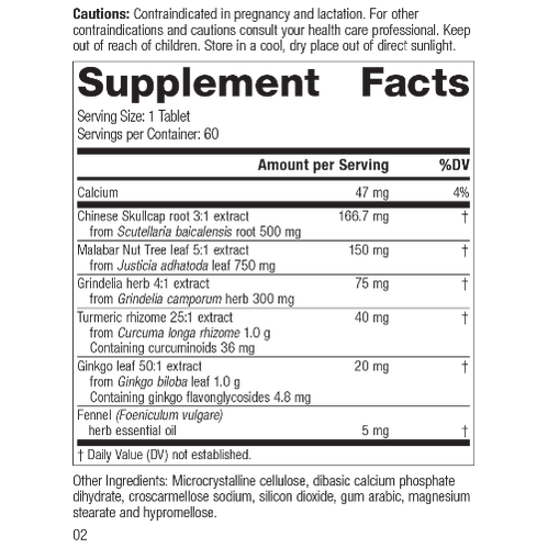 Each Serving Size (1 Tablet) contains: Calcium 47 mg, Chinese Skullcap root 3:1 extract 166.7 mg (from Scutellaria baicalensis root 500 mg), Malabar Nut Tree leaf 5:1 extract 150 mg (from Justicia adhatoda leaf 750 mg), Grindelia herb 4:1 extract 75 mg (from Grindelia camporum herb 300 mg), Turmeric rhizome 25:1 extract 40 mg (from Curcuma longa rhizome 1.0 g, Containing curcuminoids 36 mg), Gingko leaf 50:1 extract 20 mg (from Gingko biloba leaf 1.0 g, Containing gingko flavonglycosides 4.8 mg), Fennel (Foeniculum vulgare) herb essential oil 5 mg.