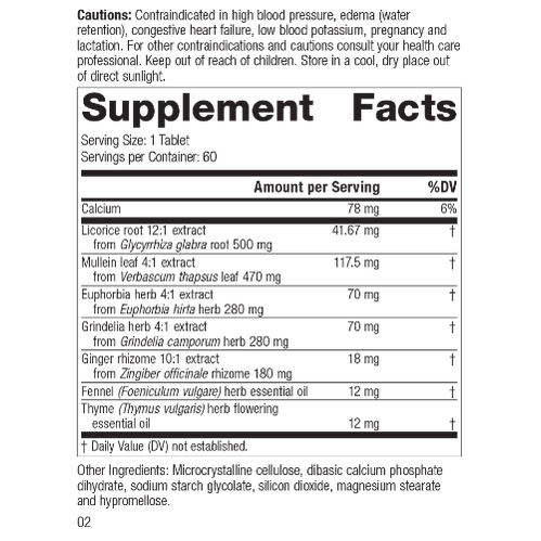 Each Serving Size (1 Tablet) contains: Calcium 78 mg, Licorice root 12:1 extract 41.67 mg (from Glycyrrhiza glabra root 500 mg), Mullein leaf 4:1 extract 117.5 mg (from Verbascum thapsus leaf 470 mg), Euphorbia herb 4:1 extract 70 mg (from Euphorbia hirta herb 280 mg), Grindelia herb 4:1 extract 70 mg (from Grindelia camporum herb 280 mg), Ginger rhizome 10:1 extract 18 mg (from Zingiber officinale rhizome 180 mg), Fennel (Foeniculum vulgare) herb essential oil 12 mg, Thyme (Thymus vulgaris) herb flowering essential oil 12 mg. Other Ingredients: Microcrystalline cellulose, dibasic calcium phosphate dihydrate, sodium starch glycolate, silicon dioxide, magnesium stearate and hypromellose.