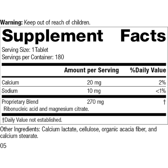 Each Serving Size (1 Tablet) contains: Calcium 20 mg, Sodium 10 mg. Proprietary Blend 270 mg: Ribonucleic acid and magnesium citrate. Other Ingredients: Calcium lactate, cellulose, organic acacia.