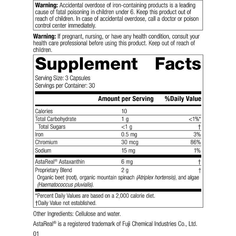 Each Serving Size (3 Capsules) contains: Calories 10, Total Carbohydrate 1 g, Total Sugars <1 g, Iron 0.5 mg, Chromium 30 mcg, Sodium 15 mg. Proprietary Blend 2 g: Organic beet (root), organic mountain spinach (Atriplex hortensis), and algae (Haematococcus pluvialis). Other Ingredients: Cellulose and water.