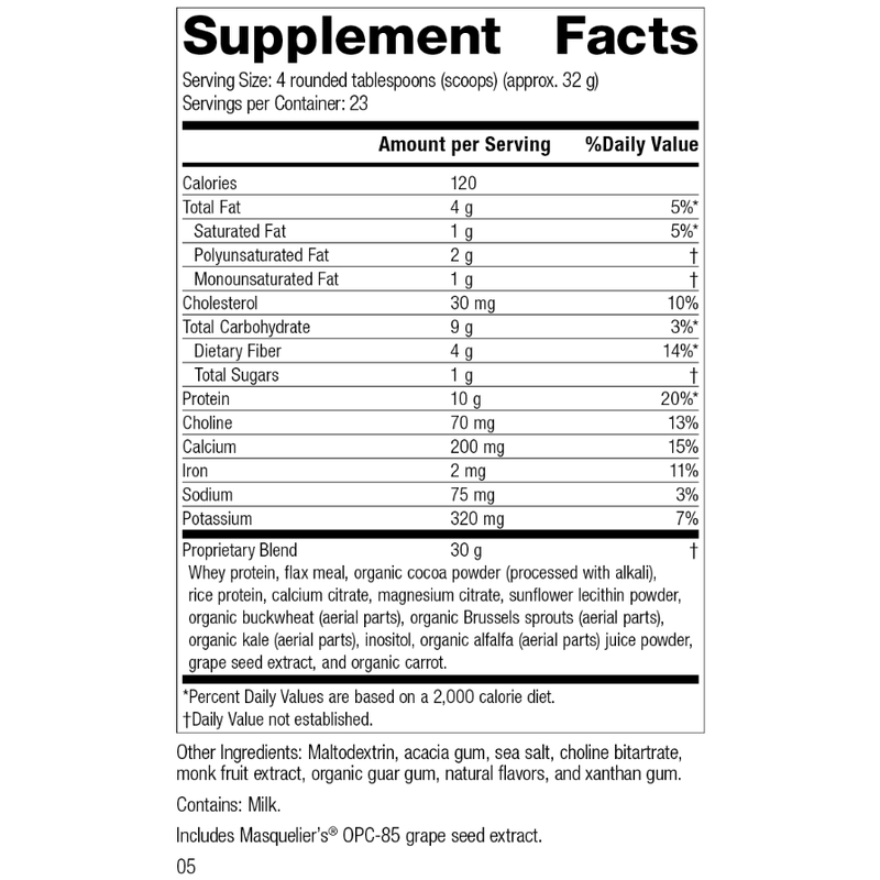 Each Serving Size (4 rounded tablespoons) contains: Calories 120, Total Fat 4 g, Saturated Fat 1 g, Polyunsaturated Fat 2 g, Monounsaturated Fat 1 g, Cholesterol 30 mg, Total Carbohydrate 9 g, Dietary Fiber 4 g, Total Sugars 1 g, Protein 10 g, Choline 70 mg, Calcium 200 mg, Iron 2 mg, Sodium 75 mg, Potassium 320 mg. Proprietary Blend 30 g: Proprietary Blend 30 g: Whey protein, flax meal, organic cocoa powder (processed with alkali), rice protein, calcium citrate, magnesium citrate, sunflower lecithin powder, organic buckwheat (aerial parts), organic Brussels sprouts (aerial parts), organic kale (aerial parts), inositol, organic alfalfa (aerial parts) juice powder, grape seed extract, and organic carrot. Other Ingredients: Maltodextrin, acacia gum, sea salt, choline bitartrate, monk fruit extract, organic guar gum, natural flavors, and xanthan gum. Contains: Milk.