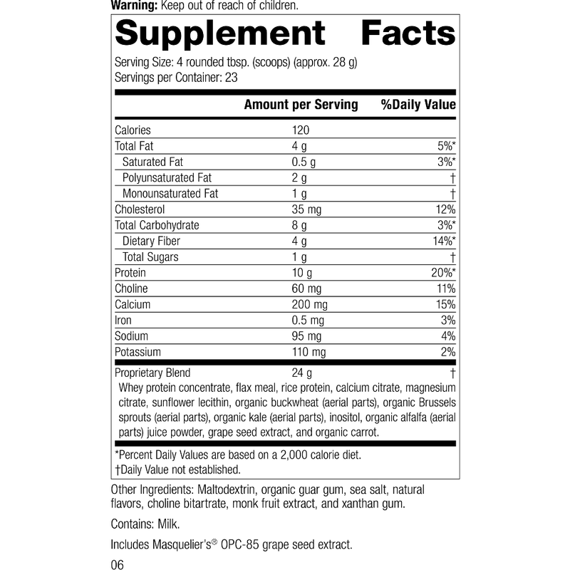 Each Serving Size (4 Rounded Tablespoons) contains: Calories 120, Total Fat 4 g, Saturated Fat 0.5 g, Polyunsaturated Fat 2 g, Monounsaturated Fat 1 g, Cholesterol 35 mg, Total Carbohydrate 8 g, Dietary Fiber 4 g, Total Sugars 1 g, Protein 10 g, Choline 60 mg, Calcium 200 mg, Iron 0.5 mg, Sodium 95 mg, Potassium 110 mg. Proprietary Blend 24 g: Whey protein concentrate, flax meal, rice protein, calcium citrate, magnesium citrate, sunflower lecithin, organic buckwheat (aerial parts), organic Brussels sprouts (aerial parts), organic kale (aerial parts), inositol, organic alfalfa (aerial parts) juice powder, grape seed extract, and organic carrot. Other Ingredients: Maltodextrin, organic guar gum, sea salt, natural flavors, choline bitartrate, monk fruit extract, and xanthan gum. Contains: Milk.