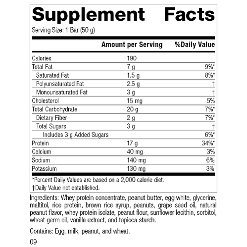 Each Serving Size (1 Bar) contains: Calories 190, Total Fat 7 g, Saturated Fat 1.5 g, Polyunsaturated Fat 2.5 g, Monounsaturated Fat 3 g, Cholesterol 15 mg, Total Carbohydrate 20 g, Dietary Fiber 2 g, Total Sugars 3 g, Includes 3 g Added Sugars, Protein 17 g, Calcium 40 mg, Sodium 140 mg, Potassium 130 mg. Ingredients: Whey protein concentrate, peanut butter, egg white, glycerine, maltitol, rice protein, brown rice syrup, peanuts, grape seed oil, natural peanut flavor, whey protein isolate, peanut flour, sunflower lecithin, sorbitol, wheat germ oil, vanilla extract, and tapioca starch. Contains: Egg, milk, peanut, and wheat.