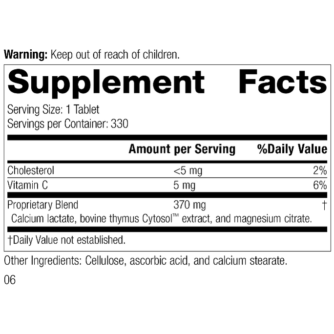 Each Serving Size (1 tablet) contains: Cholesterol <5 mg, Vitamin C 5 mg. Proprietary Blend 370 mg: Calcium lactate, bovine thymus Cytosol™ extract, and magnesium citrate. Other Ingredients: Cellulose, ascorbic acid, and calcium stearate.