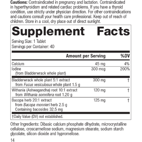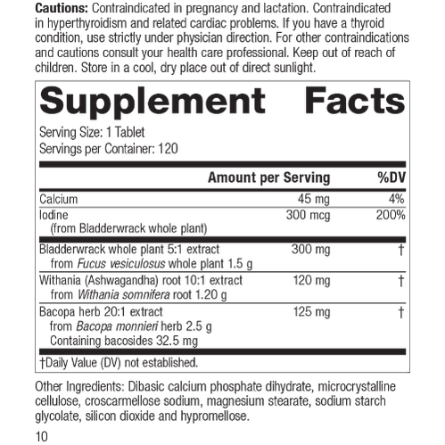 Each Serving Size (1 Tablet) contains: Calcium 45 mg, Iodine (from Bladderwrack whole plant) 300 mcg, Bladderwrack whole plant 5:1 extract 300 mg (from Fucus vesiculosus whole plant 1.5 g), Withania (Ashwagandha) root 10:1 extract 120 mg (from Withania somnifera root 1.20 g), Bacopa herb 20:1 extract 125 mg (from Bacopa monnieri herb 2.5 g, Containing bacosides 32.5 mg). Other Ingredients: Dibasic calcium phosphate dihydrate, microcrystalline cellulose, croscarmellose sodium, magnesium stearate, sodium starch glycolate, silicon dioxide and hypromellose.
